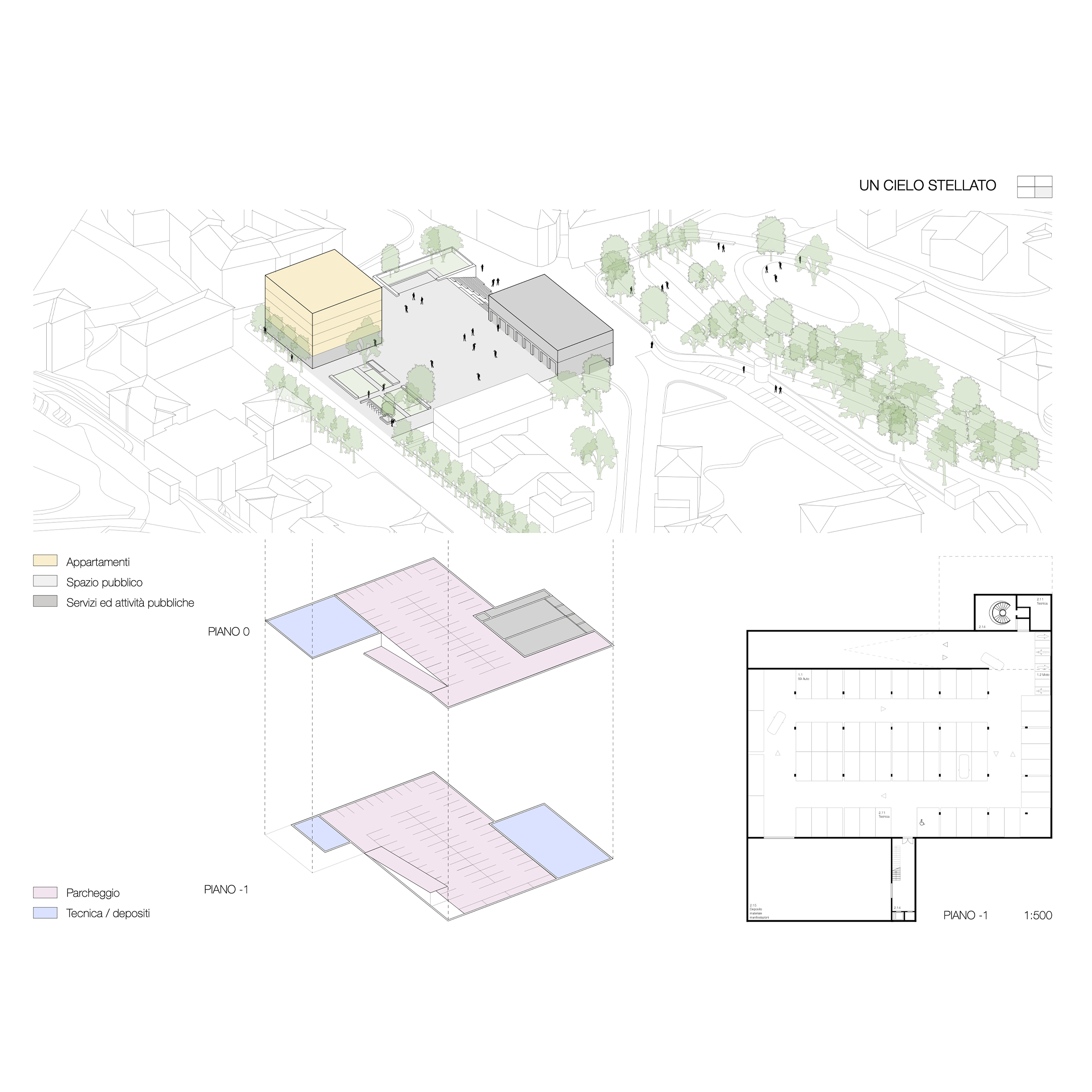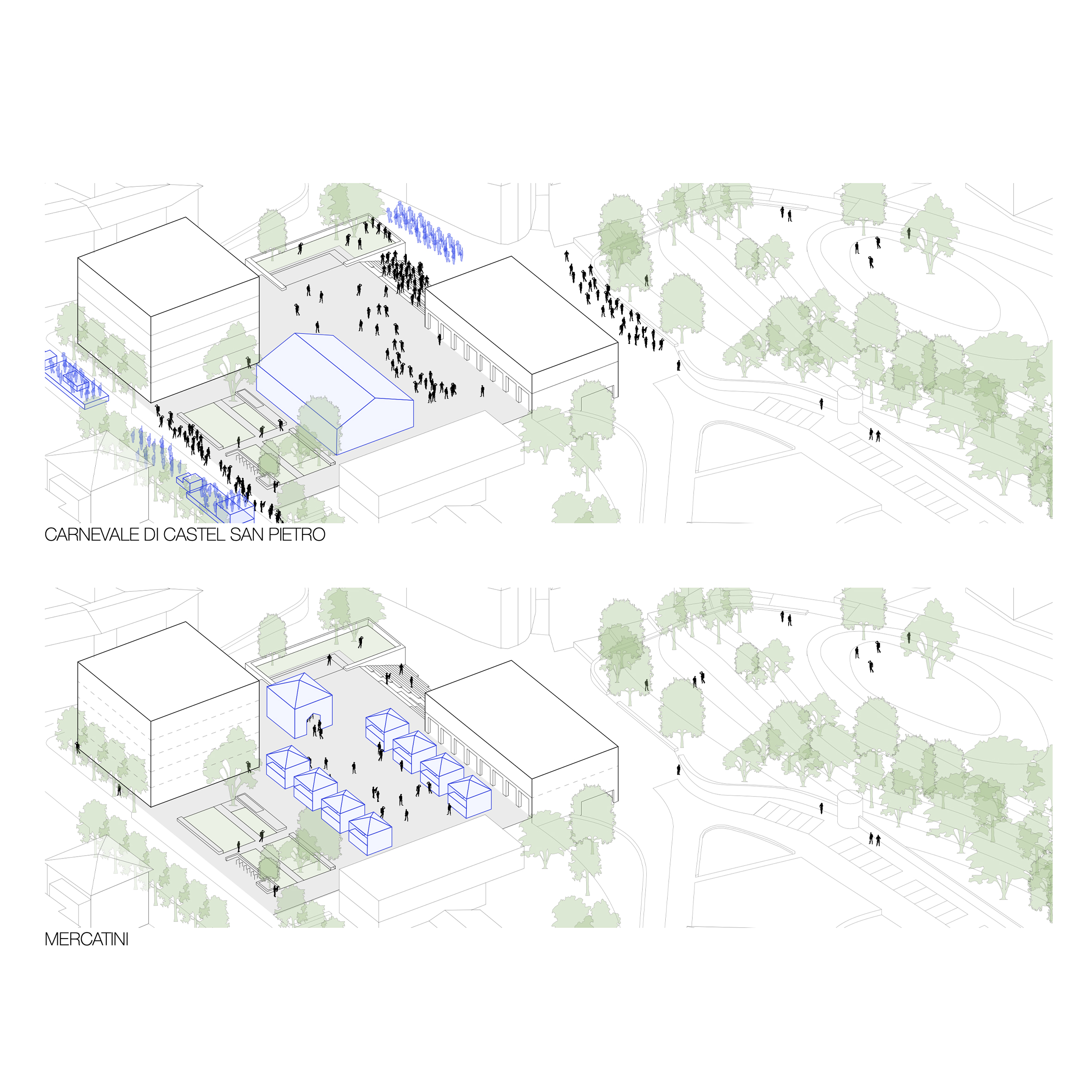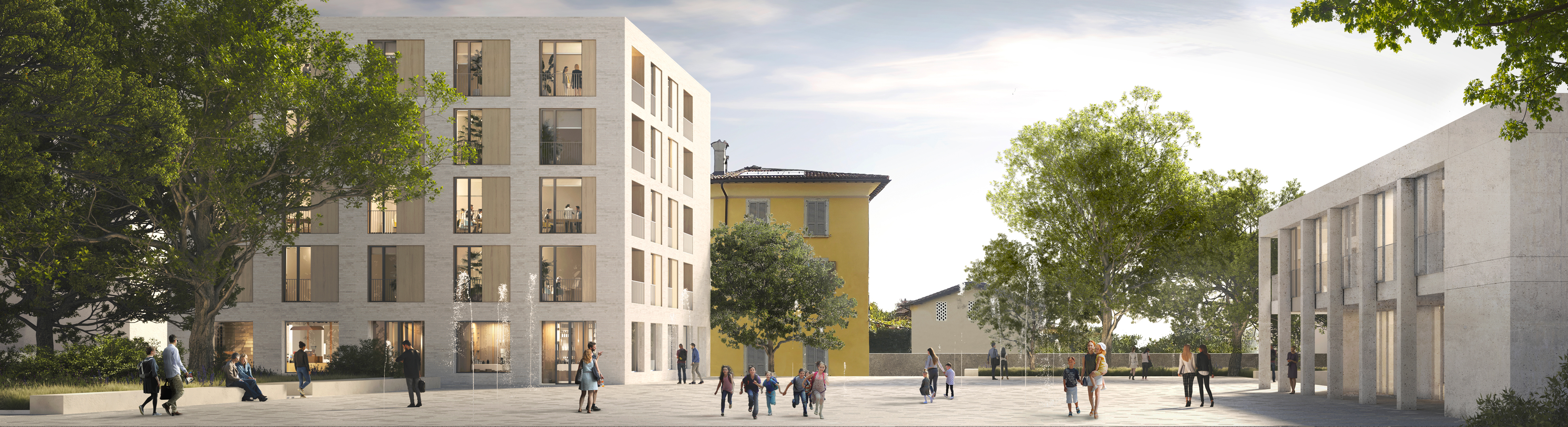 Il basamento minerale, in continuità con la quota della strada cantonale, delinea la nuova piazza di Castel San Pietro conferendole un chiaro carattere urbano.