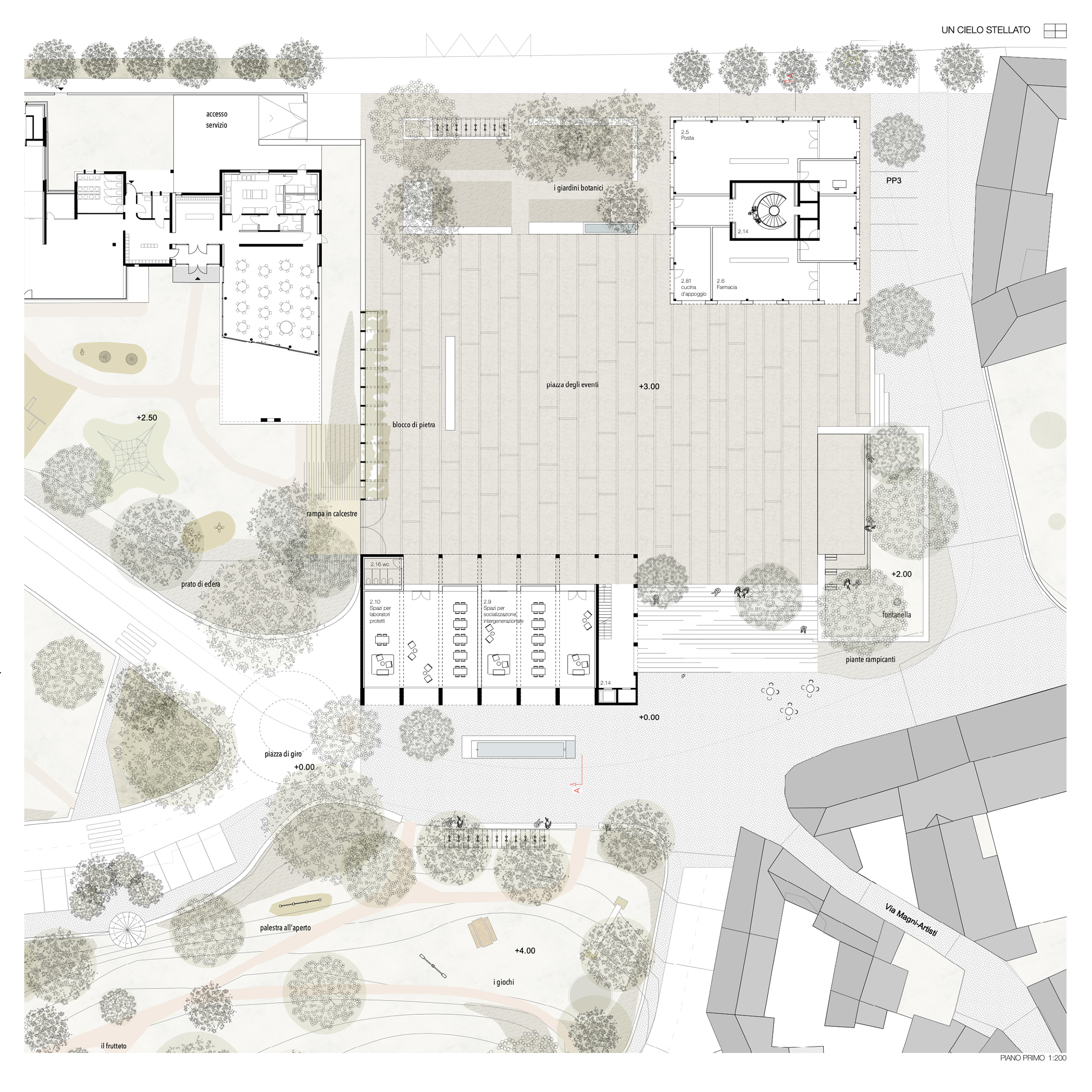 La semplicità delle forme e la scelta di materiali durevoli, rafforzano il valore pubblico dell’edificio principale.