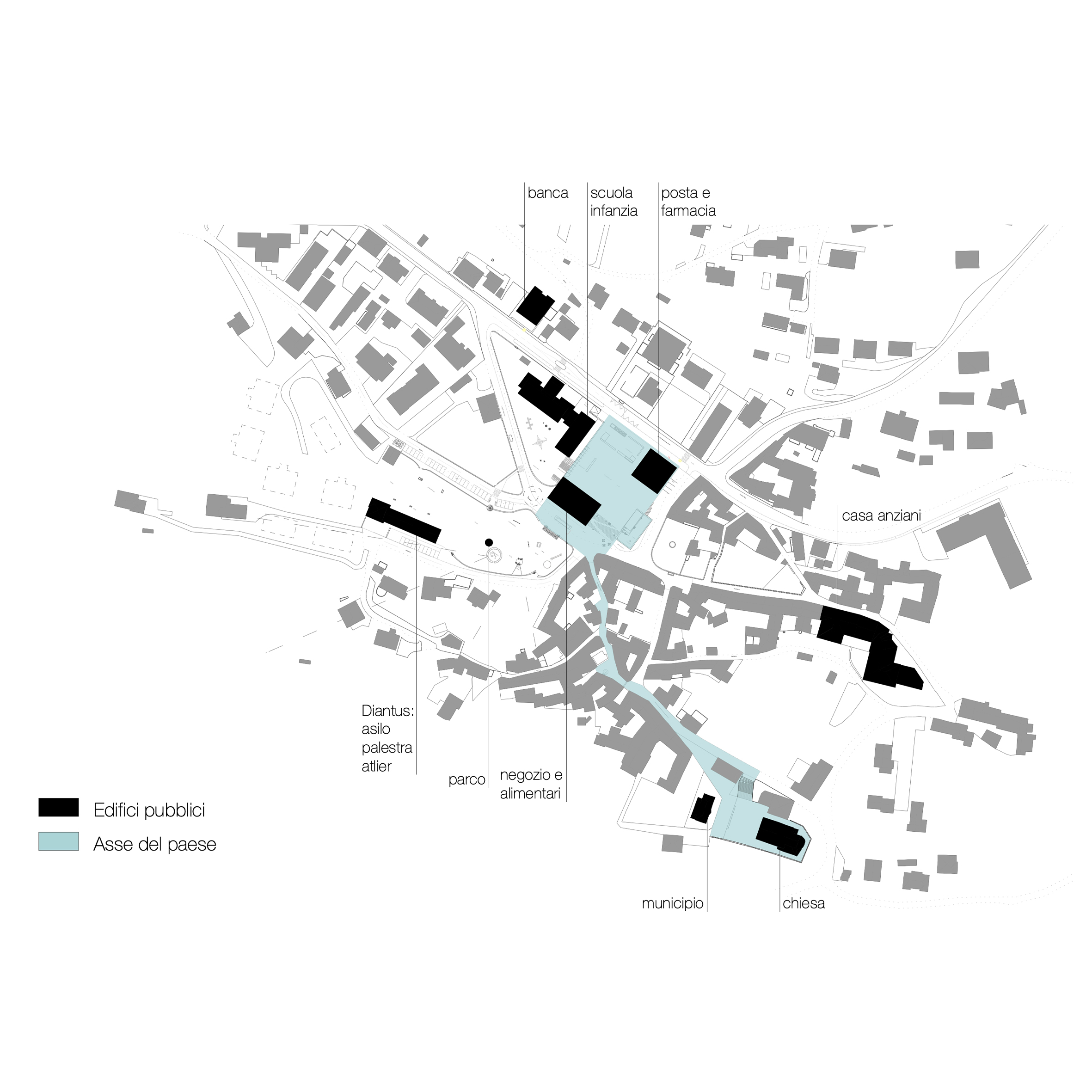 La (sua) volumetria, necessaria a bilanciare il generoso vuoto della piazza, utilizzabile per le numerose manifestazioni annuali, assurge a vera e propria porta alla cittadina.
