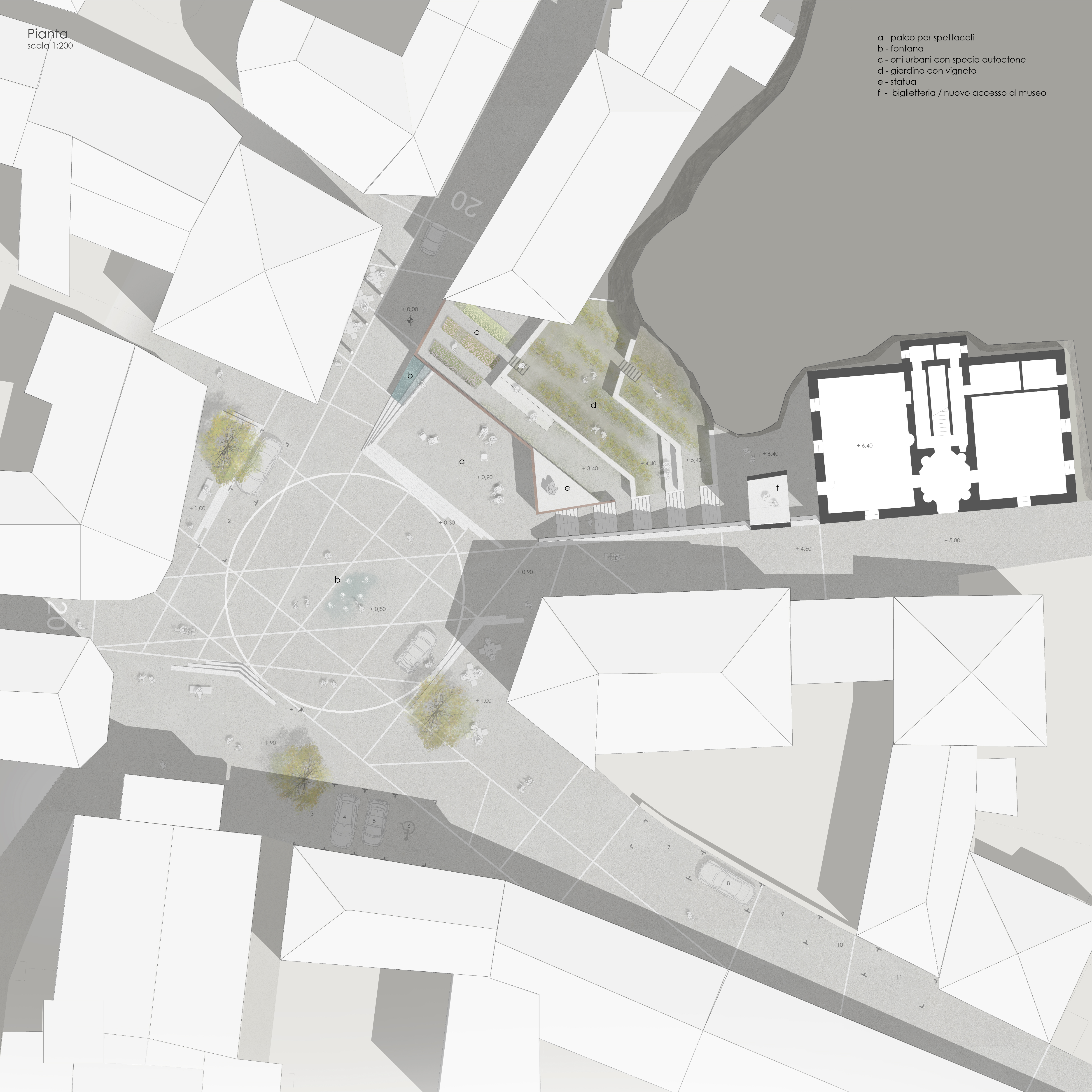 Così lo spazio piazza, mantenendo la sua attuale pendenza, viene individuato dalla figura geometrica per eccellenza: il cerchio.